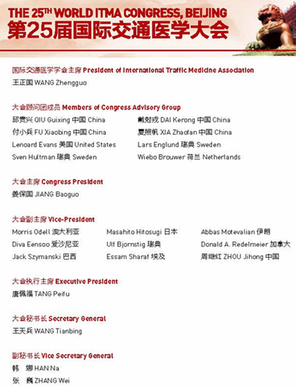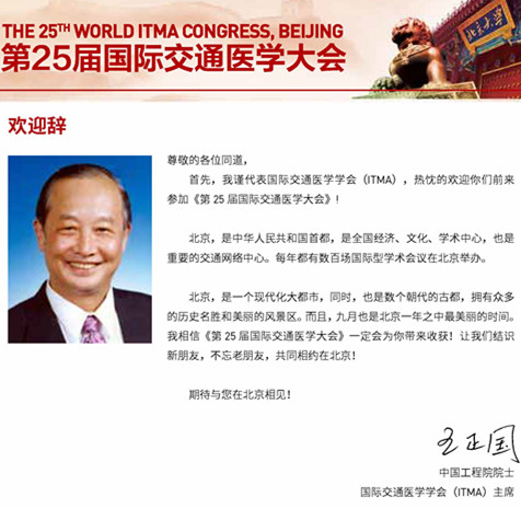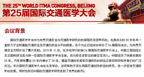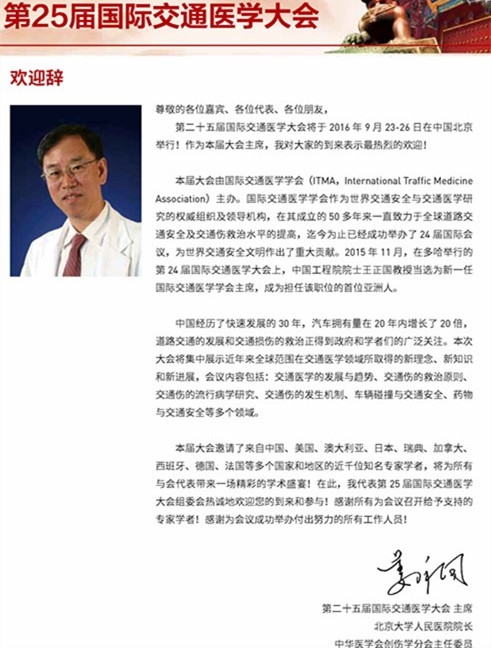 由国际交通医学会和中华医学会创伤学分会共同主办,北京大学人民医院承办的《第二十五届国际交通医学大会》定于2016年9月24-26日在中国北京召开。届时,会议将邀请来自中国、美国、澳大利亚、日本、瑞典、加拿大、西班牙、德国、法国等多个国家和地区的近千位知名专家学者,就近年来国际交通医学领域的新理念、新知识和新进展,进行深入探讨和交流,大会将集中展示交通安全和交通伤防治中所取得的最新研究成果。内容包括:交通医学的发展与趋势、交通伤的院前及院内救治、交通伤的流行病学研究、交通伤的发生机制、车辆碰撞与交通安全、药物与交通安全等。大会组委会欢迎国内外从事交通医学专业的学者踊跃投稿参会。
