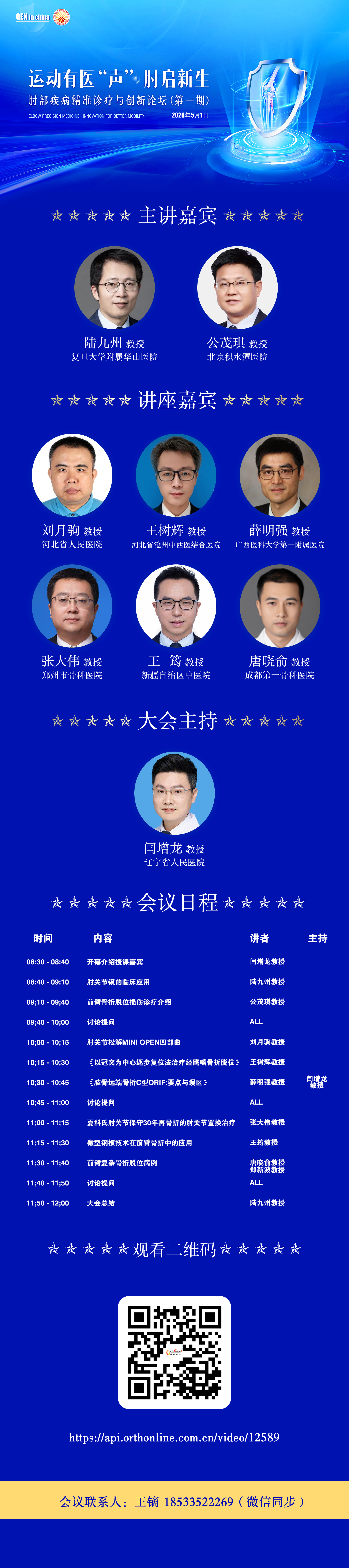 为普及肘关节健康知识,提升诊疗与康复水平,GEN in China&肩肘同行联盟 联合举办「运动有医‘声’·肘启新生」肘部疾病精准诊疗与创新论坛(第一期)定于2026年5月1日(8:30-12:00)会议采用线上公益分享形式,由骨科在线&好医术联合技术支持,特邀专家陆九州 教授(复旦大学附属华山医院)公茂琪 教授(北京积水潭医院)作为主讲嘉宾,特邀刘月驹 教授(河北省人民医院)王树辉 教授(河北沧州中西医结合医院)薛明强 教授(广西医科大学第一附属医院)张大伟 教授(郑州市骨科医院)王筠 教授(新疆自治区中医院)作为讲座嘉宾,特邀闫增龙教授(辽宁省人民医院)作为大会主持,及全国多位肘关节专家作为参与嘉宾,以讲课+病例分享+学术交流为主线,围绕肘关节损伤、骨折、僵硬松解、术后康复、运动损伤防治、典型病例解析等多维度展开,为广大患者与医务工作者带来专业、系统的科普与交流。